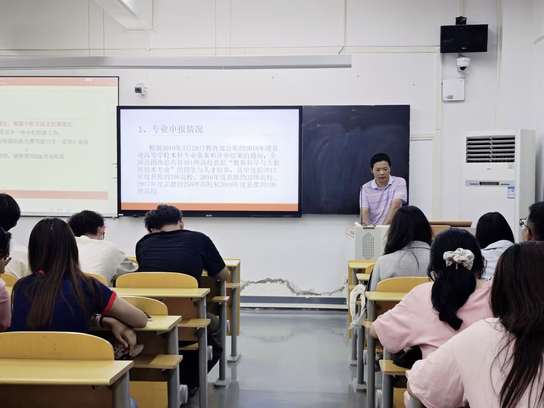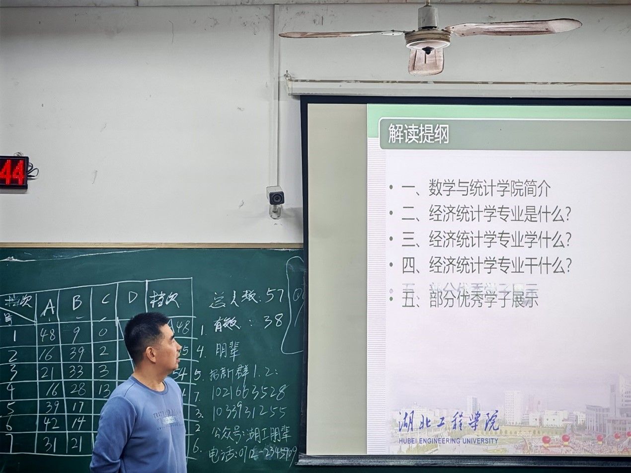 朱志锋对经济统计学专业进行了介绍。他强调,经济统计学是一门兼具理论与实践的学科,随后,朱志锋详细解读了我院经济统计学专业的办学历史、师资力量、经济统计学专业的课程设置与教学内容、获奖情况、学生考研就业情况、优秀学子展示以及丰富的校园生活等。他指出,该专业既要学习统计学,又要学习经济学。课程教学既注重基础知识的传授,又兼顾应用技能的培养。接着他介绍了该专业毕业后多元化的就业方向以及相关的学习建议,他希望同学们能够尽早做好职业规划,尽力考取本专业1、2个资格证,努力学好专业知识,积极参加市场调查与分析大赛以及统计建模大赛等,不断提升自己的思维能力以及解决实际问题的能力。